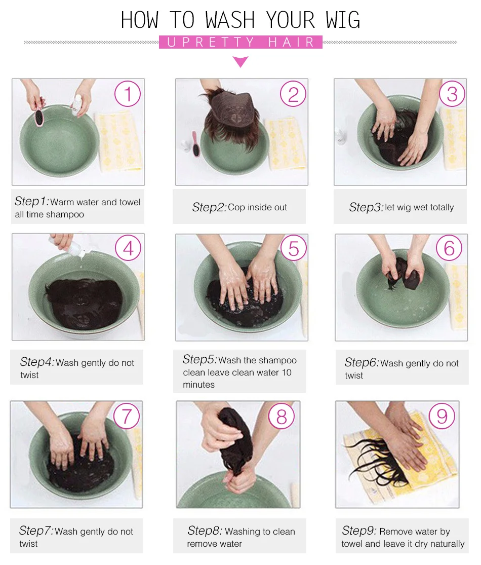 1.Blend an appropriate amount of shampoo into cold or warm water (below 25 degrees) and mix well, then completely immerse the wig, soak it for 5-10 minutes, and gently press over wig for 5-10 minutes. Don't rub with hands.