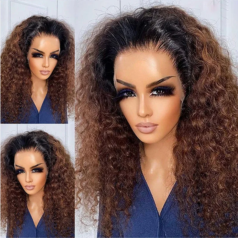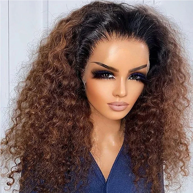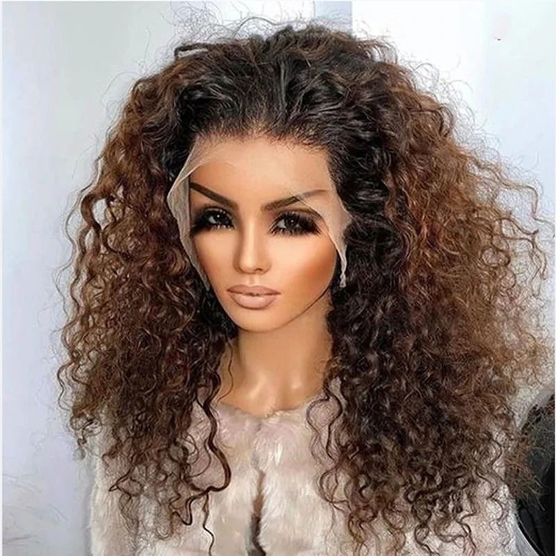 Ombre Brown Color Soft 26“Long Kinky Curly 180Density Lace Front Wig Synthetic For Women High Temperature Glueless Daily